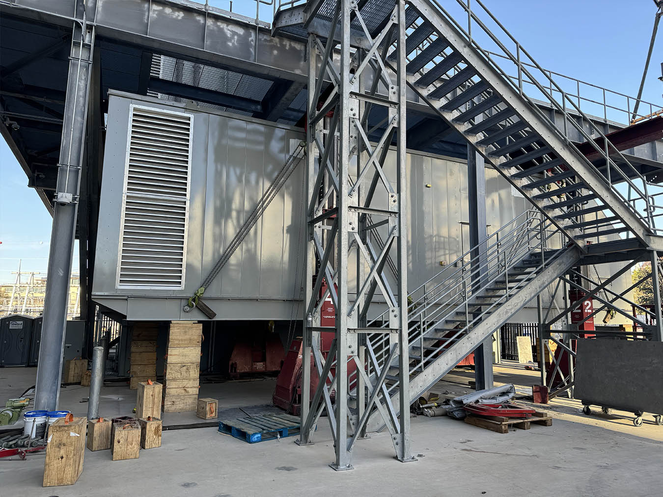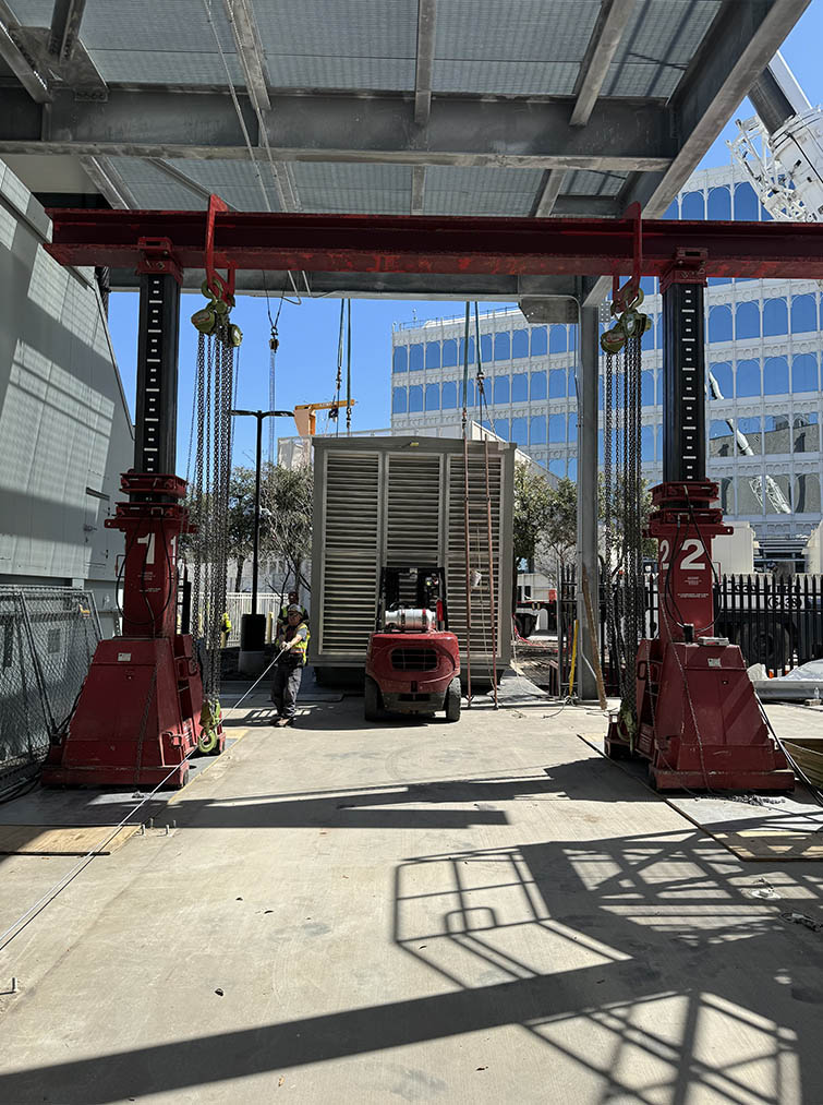 The MEI team offloaded and set the 50’ x12’ subframe onto an MEI platform, then rigged and secured the generator. The MEI crew rigged and set the enclosure and married together all 3 pieces to be moved as one, weighing 126,000 lbs. With precision, using eight trail skates along with the winches, the team skated the assembled generator under the customer’s steel structure. Once in place, the team then rigged the 3-piece generator to the 250-ton gantry set using the (8) 10-ton chain hoists. MEI then hoisted the generator within ¼” of the overhead steel structure and placed maroon blocks under it for safety. The next step was to rig, offload, and pin roll (2) 25’L x 12’W steel tanks (25,000lbs each) using the MEI platform, 1” pin rollers, and winches. The MEI team carefully pin-rolled each tank under the generator with only ½” clearance between the tank stub-ups and the bottom of the subframe. Once both tanks were set in place and married, the team used the 250-ton gantry to carefully lower the 3-piece generator onto the tanks, ensuring all bolt holes, exhaust, and fuel lines lined up and married together to complete the scope.