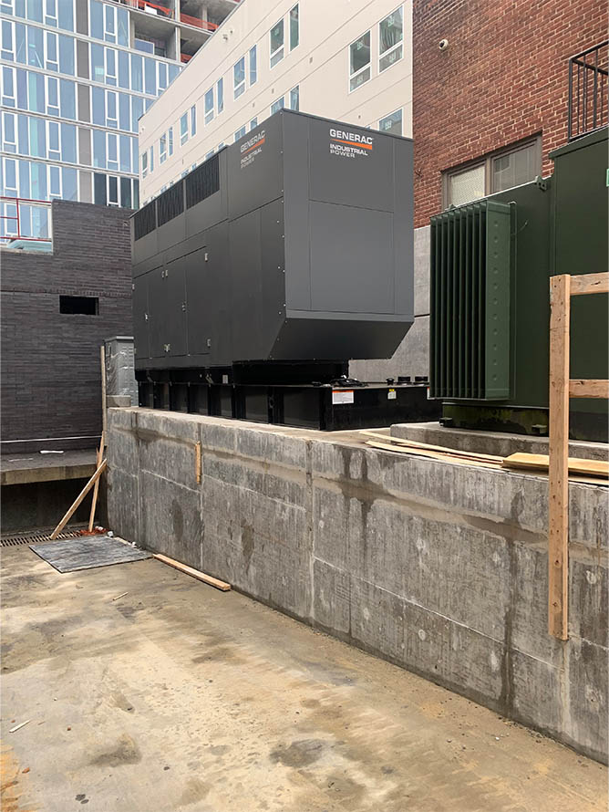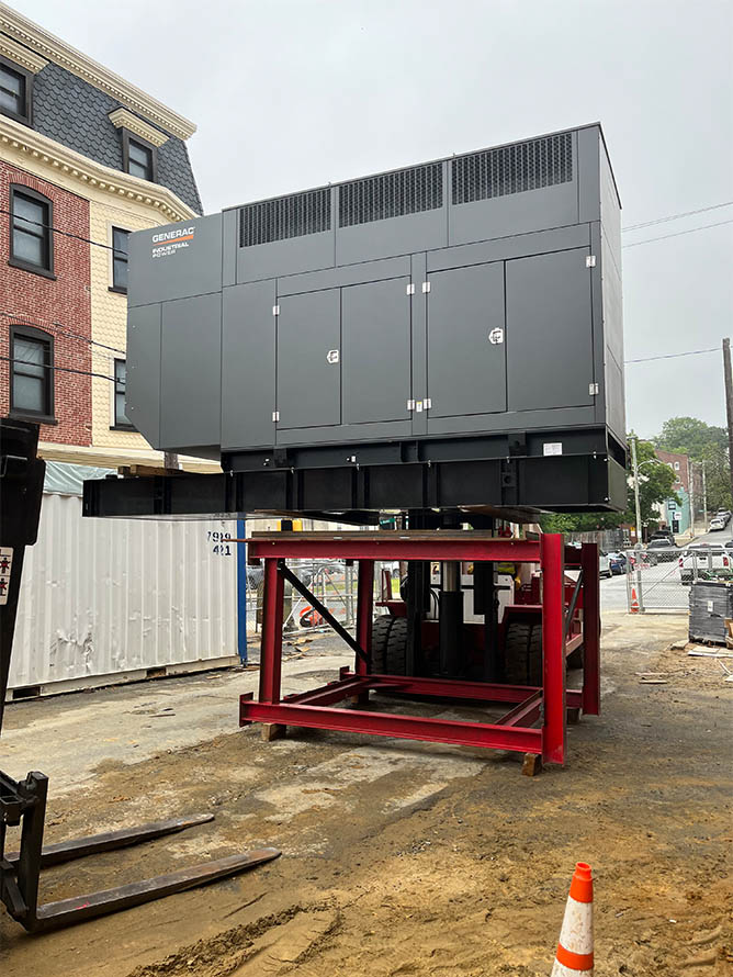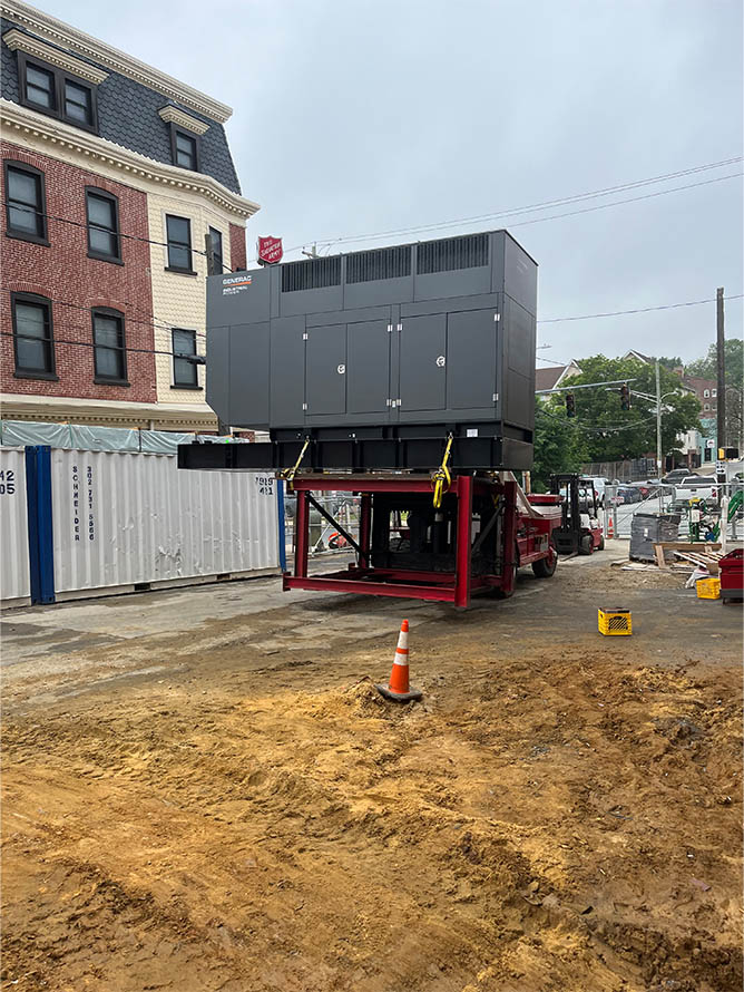 A&A took on a unique project involving the installation of an 18,000 lb. generator in a residential area. The presence of overhead wires would have made it difficult to use a crane for the installation, as switching off the power would have inconvenienced the neighbors along with the project site.