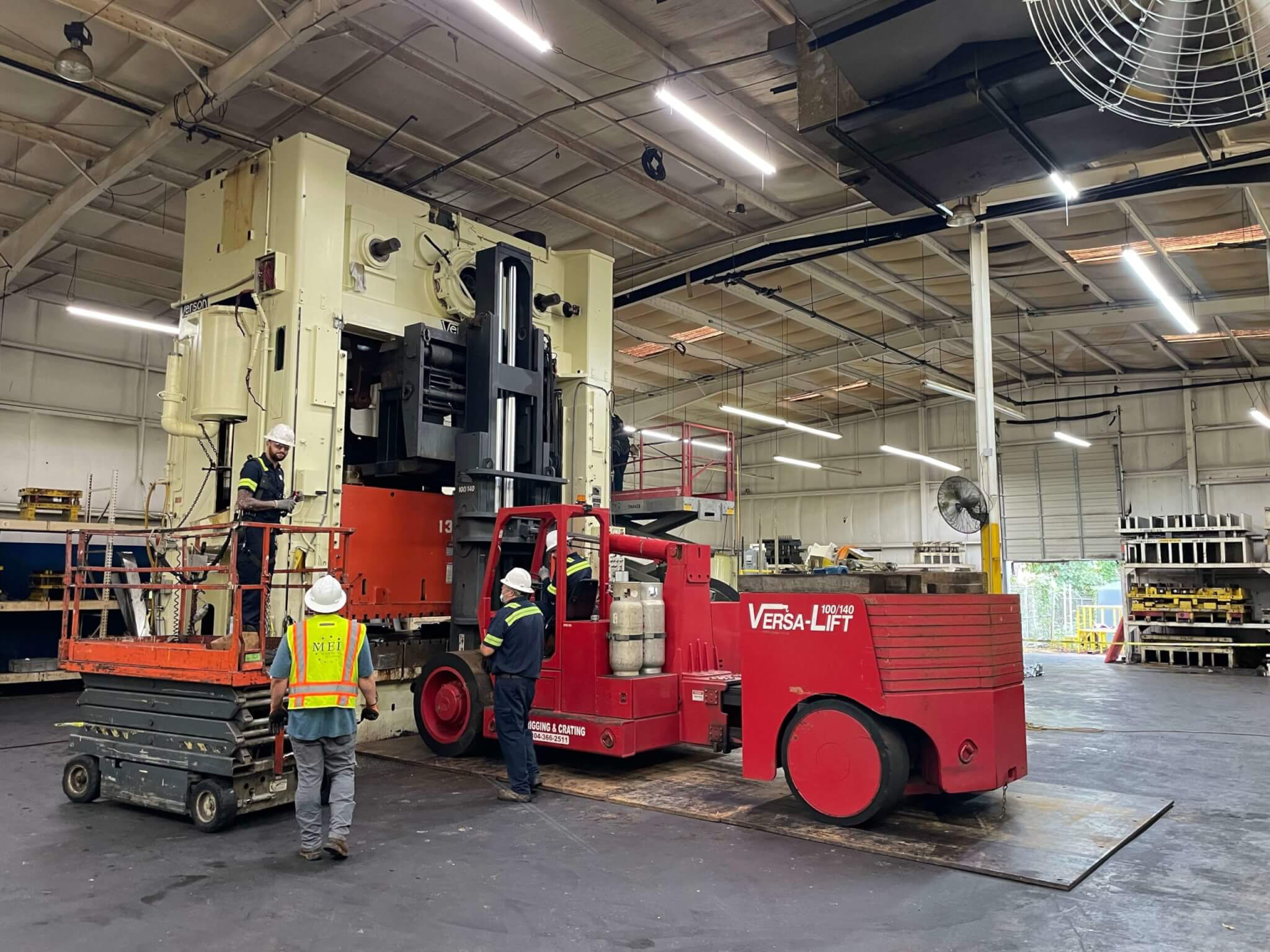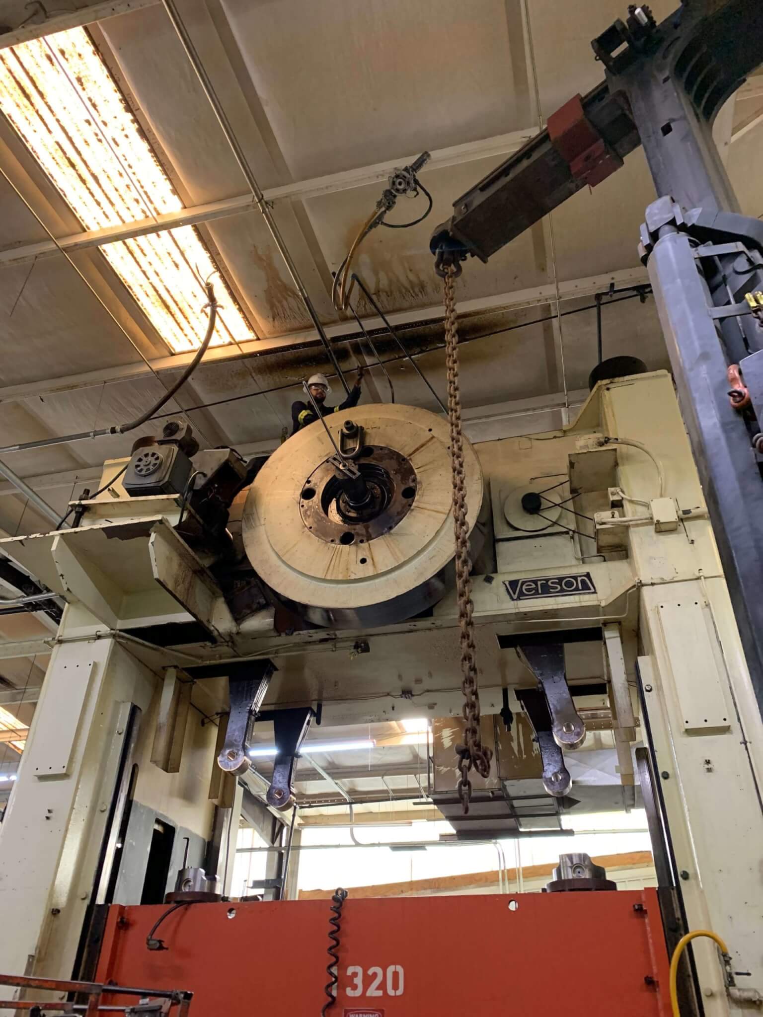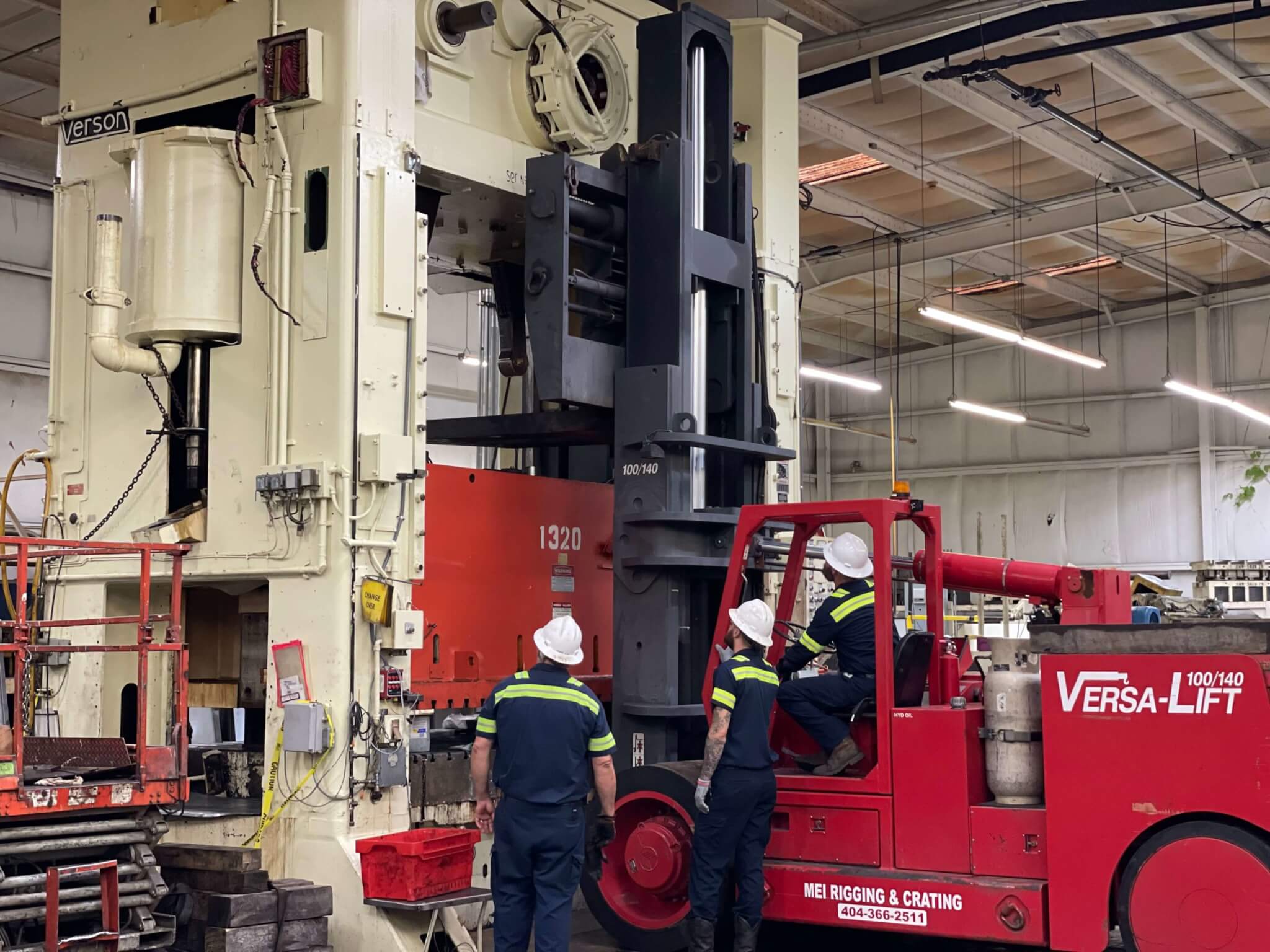 The MEI rigging crew completed a large project to remove a crown from a 135,000 pound Verson press machine (including the flywheel) to perform much needed repairs in Morrow, GA.