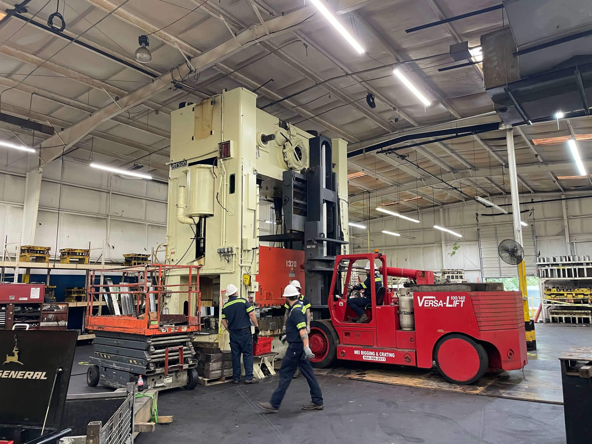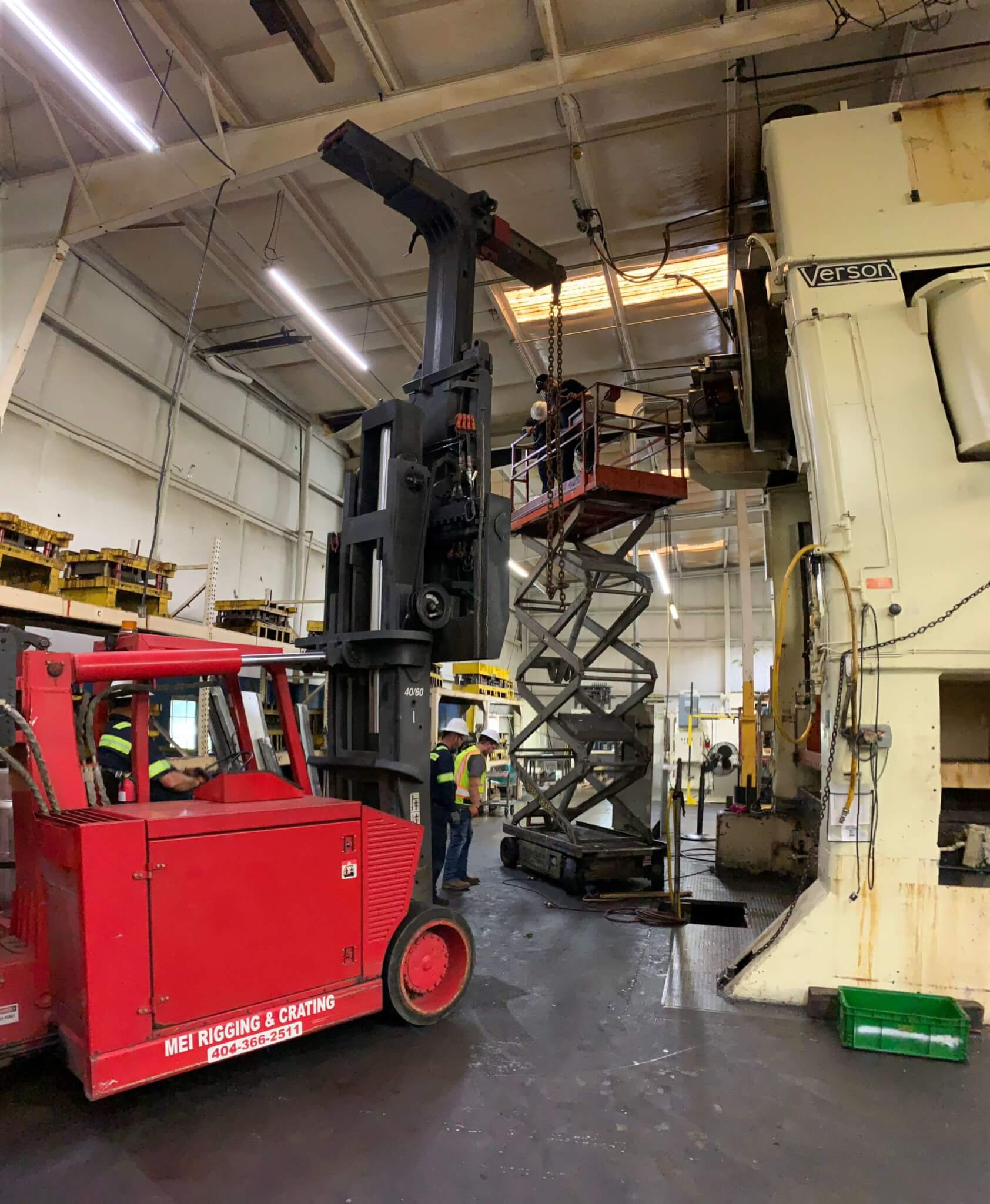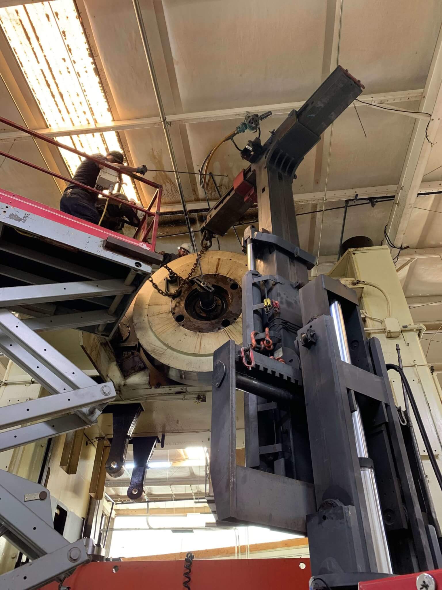 The MEI rigging crew completed a large project to remove a crown from a 135,000 pound Verson press machine (including the flywheel) to perform much needed repairs in Morrow, GA.