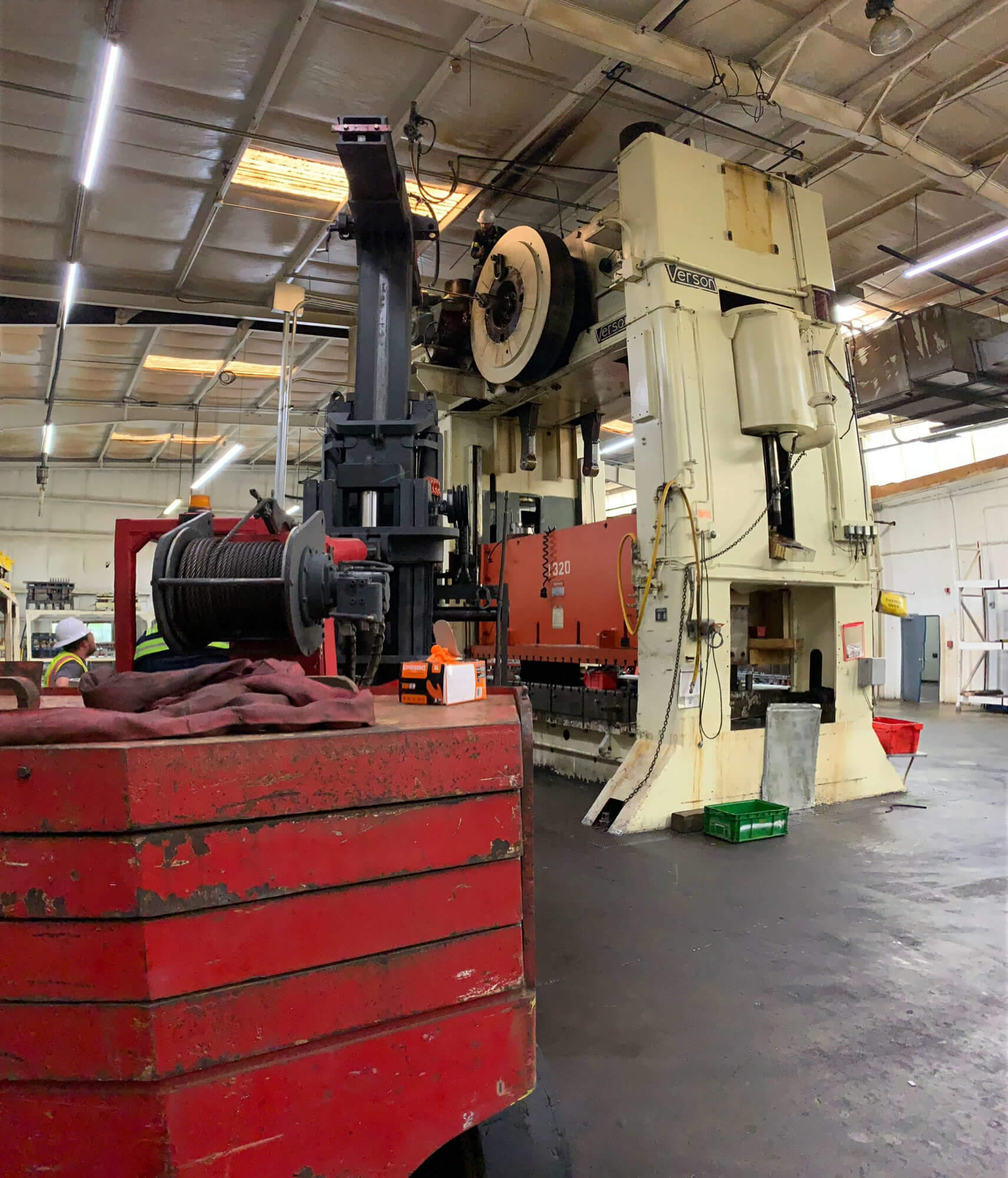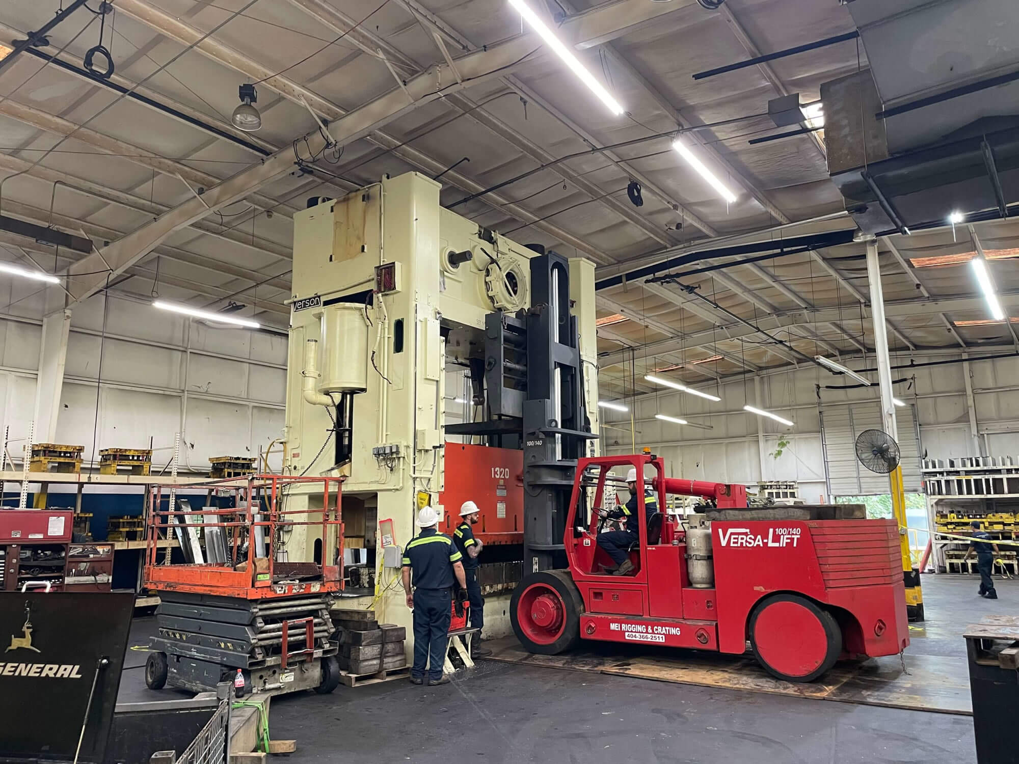 This press machine crown removal, which spanned over three days, was intricate and required various lifts to complete. Using the 100/140 Versa Lift, the biggest forklift available on the market with the capacity to lift 100,000 pounds easily or 140,000 pounds with the base extended, the 40/60 Versa Lift specifically built for power, maneuverability and up to 60,000 pounds in lifting power, and lastly the Hyster heavy duty, heavy capacity 15k forklift.